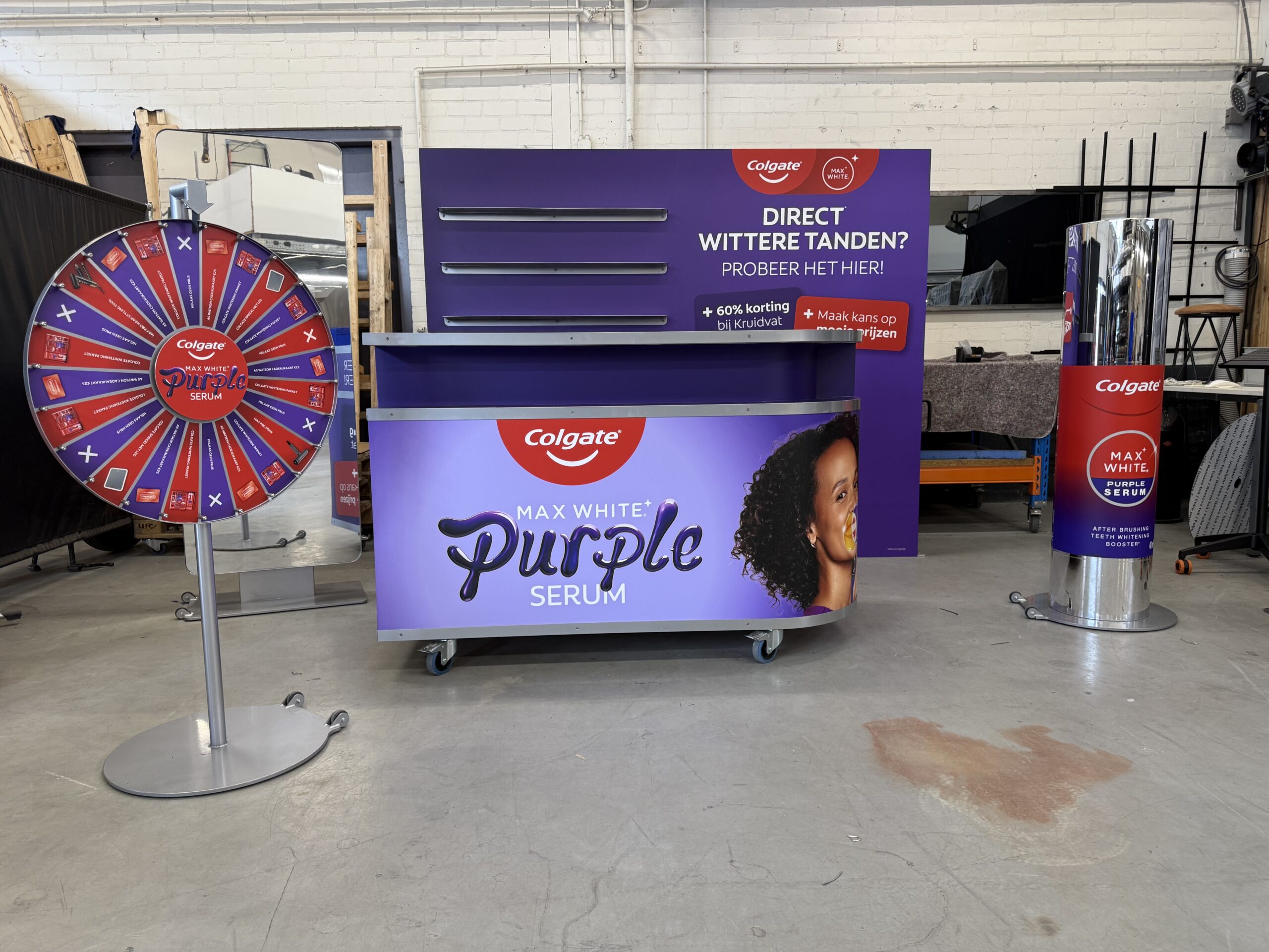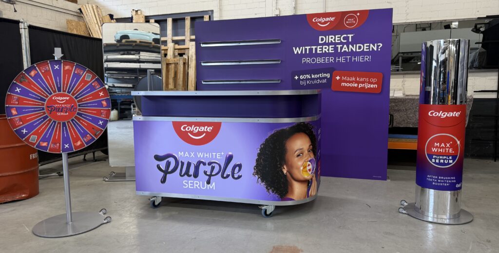 In het najaar van 2025 realiseerden we een complete setting voor de merkactivatie van het nieuwe product Max White Purple Serum van Colgate.